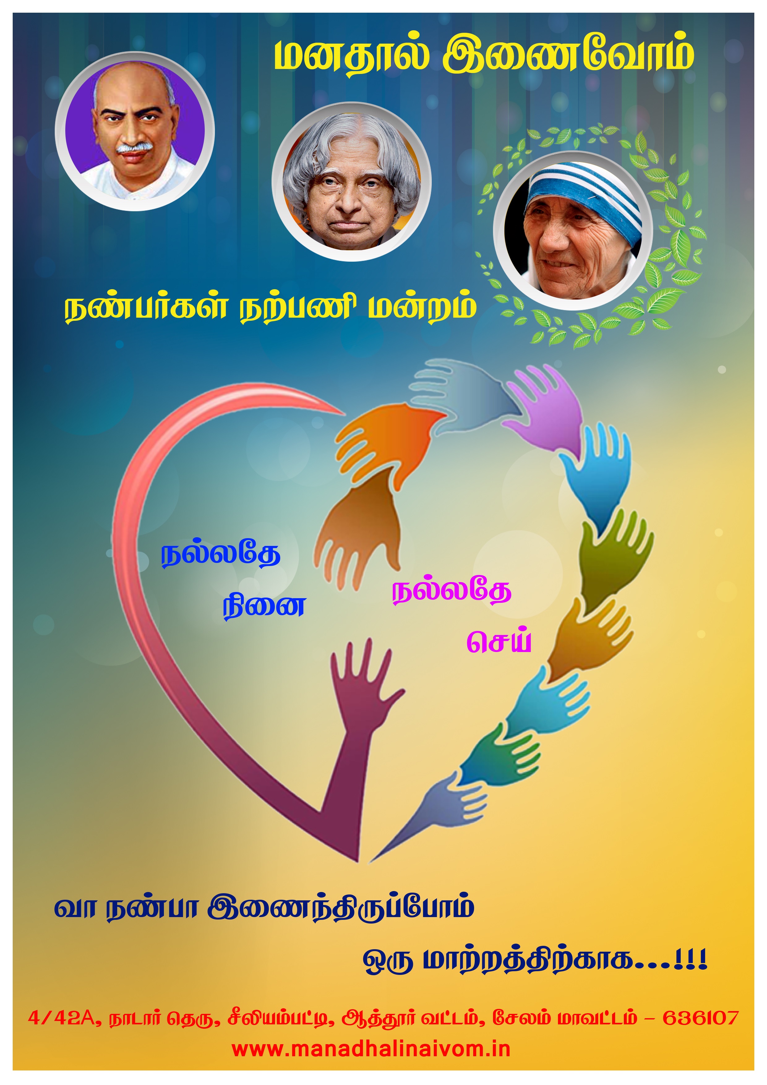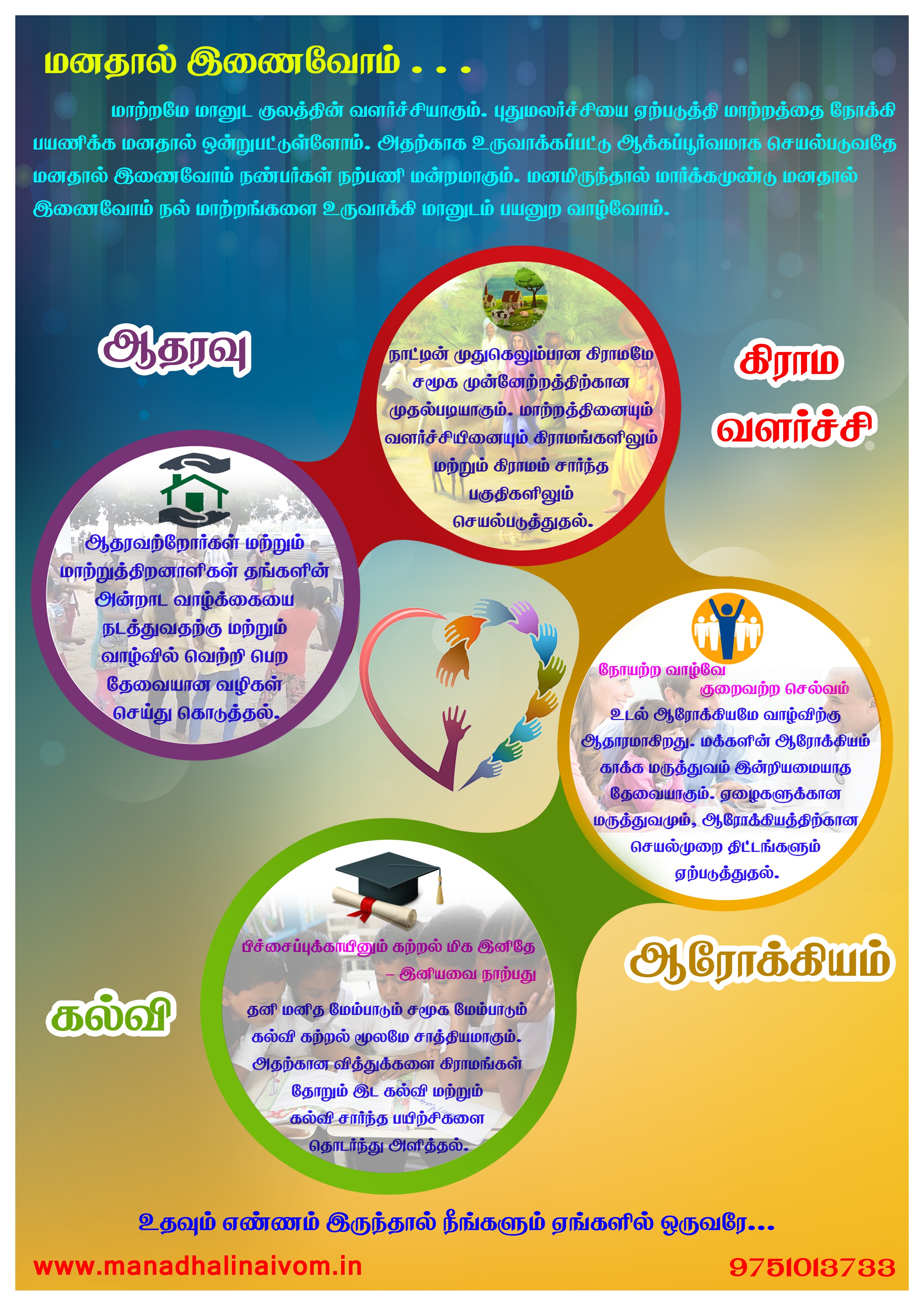 Manadhal Inaivom - Trust founded by Mr.S.Vetrivel, Mr.P.Karunakaran. Mr.S.Venkatachalam and Mr.M.Raja established on 2018. Manadhal Inaivom Trust is a Tamil nadu based NGO(Non Government Organization) on community development and capacity building within the local migrant and low - socioeconomic community. Working towards helping to sudents to achieve their goal and people to meet their dreams. We are as an organization believe that people should not be denied their rights because of where they were born.